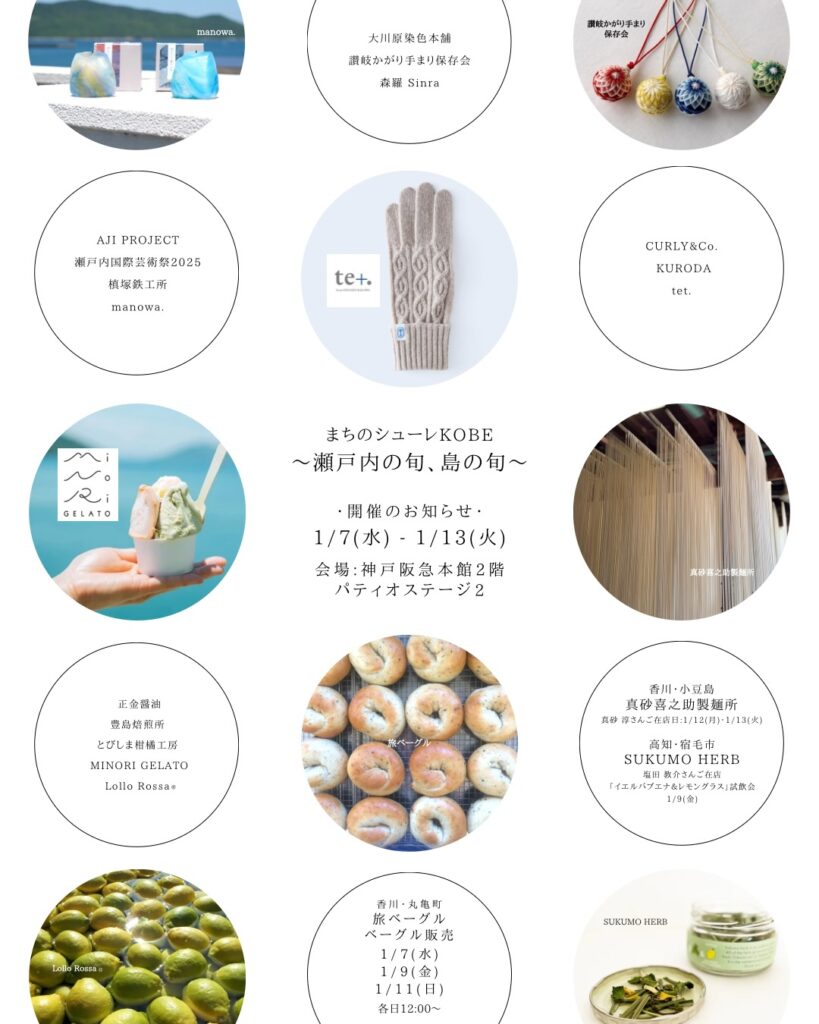 12.13日は店頭に販売しに行きますのでぜひお越しください。 【イベントのお知らせ】 「瀬戸内の旬、島の旬」 会場:神戸阪急本館2階 パティオステージ2 日程:1月7日(水)〜1月13日(火) _ 瀬戸内・四国には、冬ならではの旬があります。例えば夏のイメージが強いレモンは、冬場が収穫の最盛期。 小豆島や香川県本土でも盛んに栽培されているオリーブも、その年の新物の搾りたてオリーブオイルが並ぶ時期は冬なのです。 冬の瀬戸内とその島々、そしてその向こうの四国を代表する旬の食品や、暮らしの道具、伝統的な技術をベースに暮らしに 寄り添った工芸品、冬の暮らしに欠かせない手袋などの服飾品。 瀬戸内、四国、そして香川の確かなものを、まちのシューレがセレクトしてお届けします。 この機会に、瀬戸内の新しい魅力に触れてみてはいかがでしょうか。 皆さま、ぜひ楽しみにお越しくださいませ。  ̄ 出店者 ⚪︎食品 アグリオリーブ @agri_olive /かまパン&ストア @food_hub_project /グリュースゴット @gg.yuko / SUKUMO HERB /soefarm @soefarm /正金醤油 @shokinshoyu /DADA NUTS BUTTER @dadanutsbutter / 旅ベーグル @hebimichio /豊島焙煎所 @teshimaroastery /とびしま柑橘工房 @tobishima_lemon / 西村ファーム @kankyoplan /MINORIGELATO @minorigelato /HOMEMAKERS @homemakers.jp / 真砂喜之助製麺所 @masago_kinosuke /三豊オリーブ @mitoyoolive /RACATI @racati_chocolate / ロロロッサ @lollorossa_lemon ⚪︎服飾・手しごと・工芸 AJI PROJECT @ajiproject /大川原染色本舗 @ookawaharasenshokuhonpo / CURLY&Co. @curly.cs /KURODA @kuroda_tebukuro / 讃岐かがり手まり保存会 @sanukikagaritemari / 新羅 Sinra. @sinra_sanukiurushi /瀬戸内国際芸術祭2025 @setouchi_triennale /tet. @tet.jp / 槙塚鉄工所 @makizuka.altana /manowa. @manowa._kagawa #まちのシューレkobe #まちのシューレ #神戸阪急 #瀬戸内 #四国